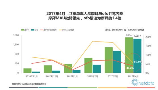 無論是從比來ofo粉絲們的瘋狂“曬照”模式,還是從最新Trustdata發布的 4 月共享單車行業最新數據顯示:ofo4 月用戶環比增速更為迅猛高達55.1%,為摩拜用戶增速的1. 4 倍。ofo都以絕對優勢占領著用戶市場,完勝行業第二。據悉,ofo月活用戶的環比增速已連續 7 個月超越摩拜。目前,ofo4 月用戶增速又再次超越摩拜,創下用戶環比增速連續 8 個月超越摩拜的行業最高新記錄,持續成為增速最快的共享單車平臺。