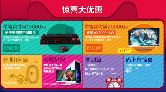同時,寧美國度設置分期購活動,最高可享 12 期分期。部分商品通過天貓學生認證者擁有專享活動價。 618 期間主機搭配顯示器最高可降 200 元,別的還有多款精品主機參加聚劃算,喜歡的伴侶定好鬧鐘,千萬不要錯過。