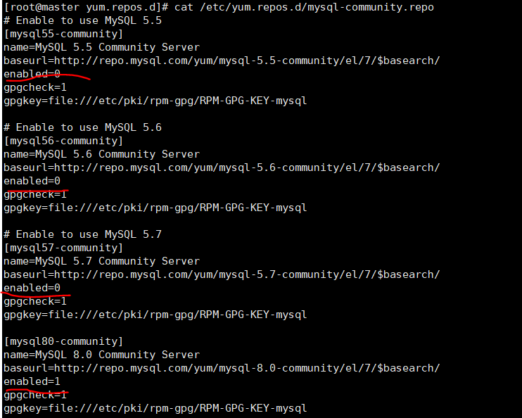 因為官網最新的repo源中,包括了mysql的許多版本,可以通過cat /etc/yum.repos.d/mysql-community.repo ,修改各版本的enabled的值來確定安裝哪個版本