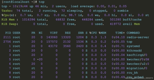 top命令是Linux下常用的性能分析工具,能夠?qū)崟r(shí)顯示系統(tǒng)中各個(gè)進(jìn)程的資源占用狀況,類(lèi)似于Windows的任務(wù)管理器。