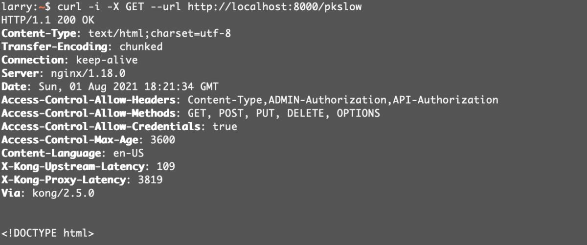 $ curl -X POST --url http://localhost:8001/services/ --data 'name=pkslow' --data 'url=https://www.pkslow.com'