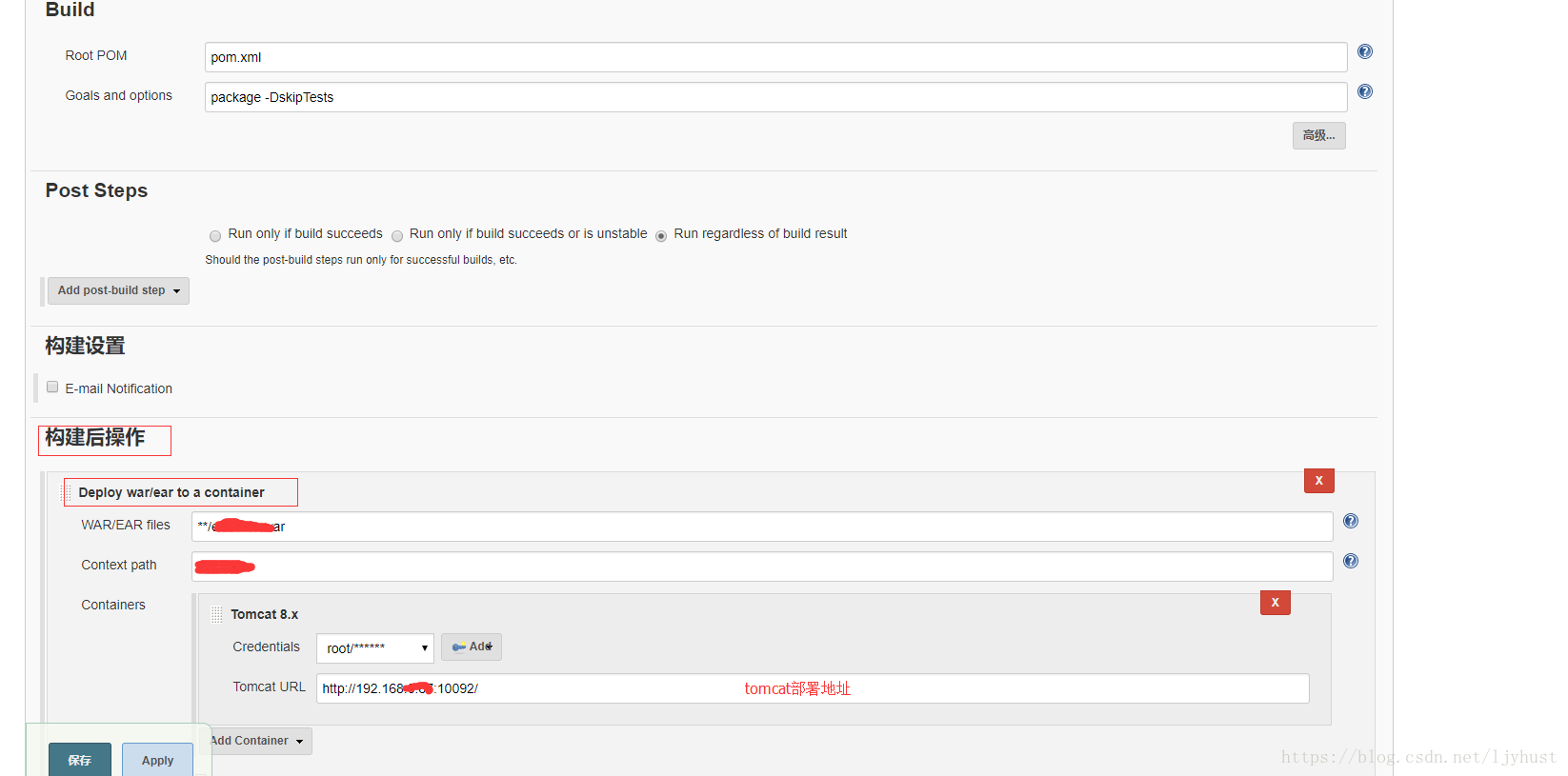 參照下圖保存配置后,即可構建maven項目,jenkins會復制編譯后的war項目到192.168.1.12服務器對應的tomcat路徑下,然后啟動Tomcat部署項目。