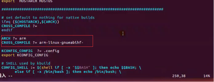 注意:到這里內(nèi)核與設(shè)備樹的編譯就算完成了,如果細(xì)心的小伙伴就會(huì)發(fā)現(xiàn),為啥我的命令會(huì)長一些。每個(gè)指令中都用“ARCH=arm CROSS_COMPILE=arm-linux-gnueabihf-”,這是設(shè)置編譯器為交叉編譯器。為了使編譯指令簡介一些,可以在Makefile文件中添加ARCH和CROSS_COMPILE的配置,以后就可以編譯時(shí)就可以省掉命令中的“ARCH=arm CROSS_COMPILE=arm-linux-gnueabihf-”部分,如下圖所示: