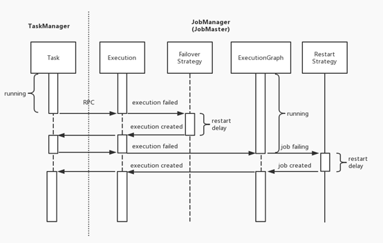 Flink 的錯誤恢復(fù)機制分為多個級別,即 Execution 級別的 Failover 策略和 ExecutionGraph 級別的 Job Restart 策略。當出現(xiàn)錯誤時,F(xiàn)link 會先嘗試觸發(fā)范圍小的錯誤恢復(fù)機制,如果仍處理不了才會升級為更大范圍的錯誤恢復(fù)機制,具體可以看下面的序列圖。