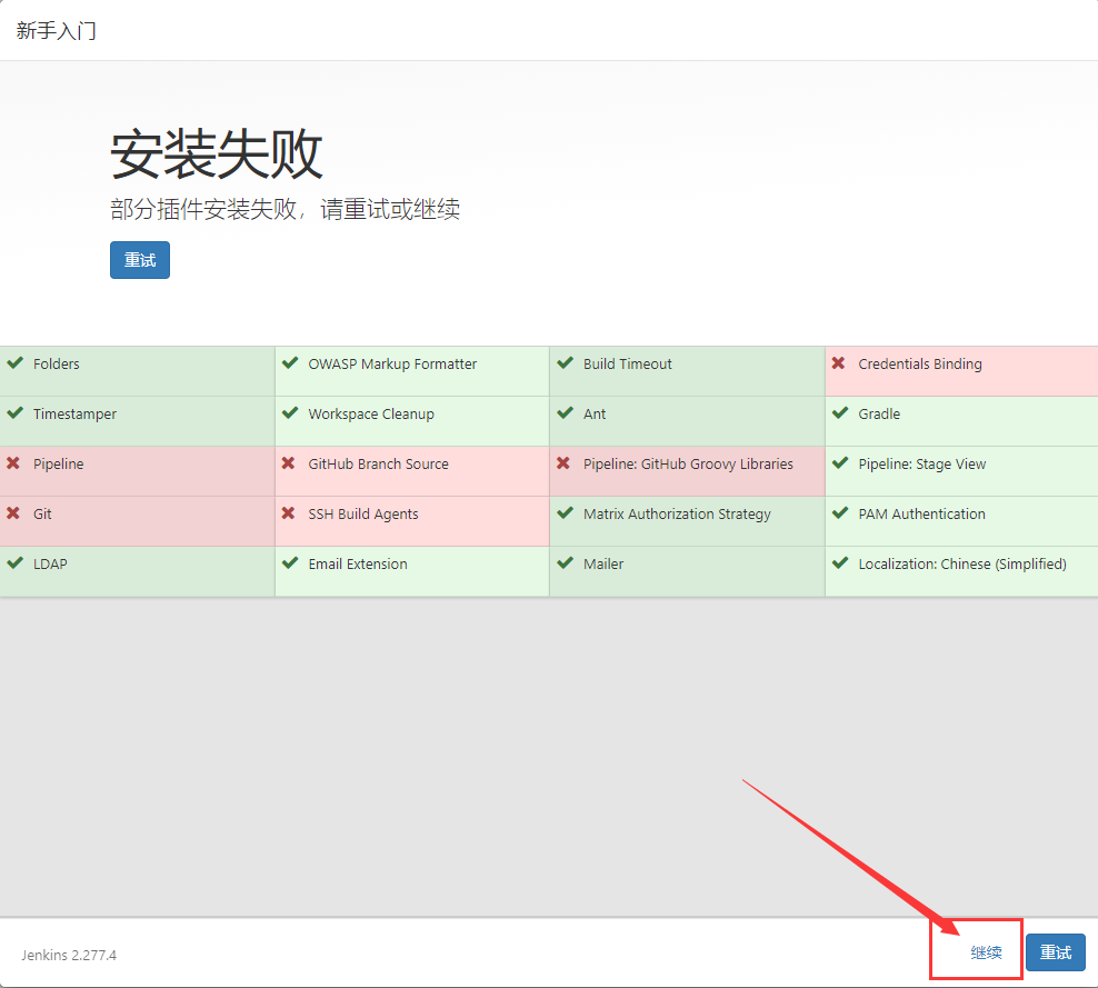 經(jīng)過漫長(zhǎng)的等待之后,由于網(wǎng)絡(luò)環(huán)境、依賴項(xiàng)的問題,很可能出現(xiàn)某些插件安裝失敗,不過咱們先點(diǎn)擊“繼續(xù)”,進(jìn)去再修復(fù)