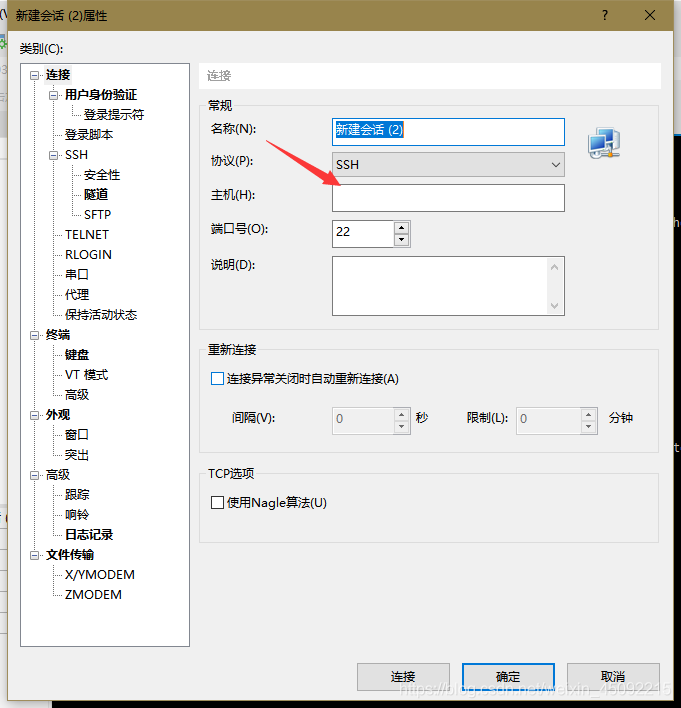 打開Xshell,新建連接,將IP地址寫入下圖框內,即可在本地建立與虛擬機的連接,后續對虛擬機的各項操作均可在Xshell終端中進行。