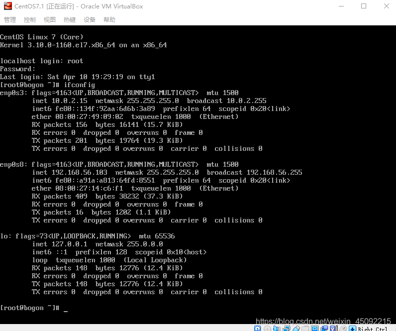 登錄后 再次輸入ifconfig命令,已經有了反饋信息,如圖將框內IP地址記下