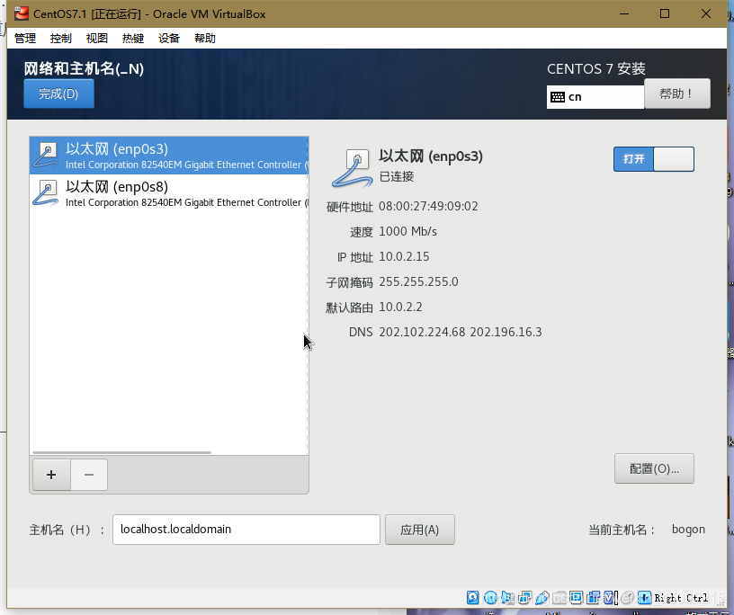 需要注意的是在參考上篇博客安裝CentOS設置網絡連接時兩個網關都要打開,具體如下: