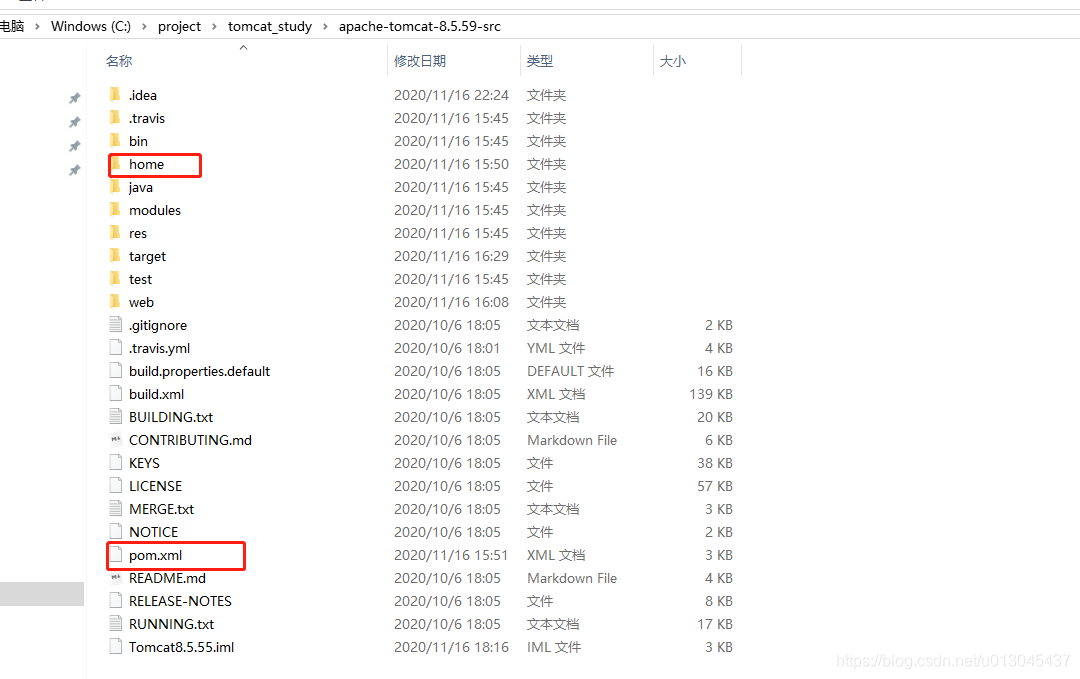 在tomcat的源碼文件夾下面創建home目錄,把源碼中的conf目錄和webapps目錄剪切到其中(其他新建的目錄如logs等),另外新建maven的pom.xml文件。