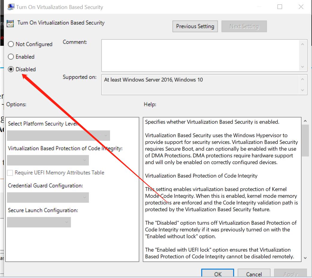 雙擊打開配置選項 Turn on Virtualization Based Security 選擇disable
