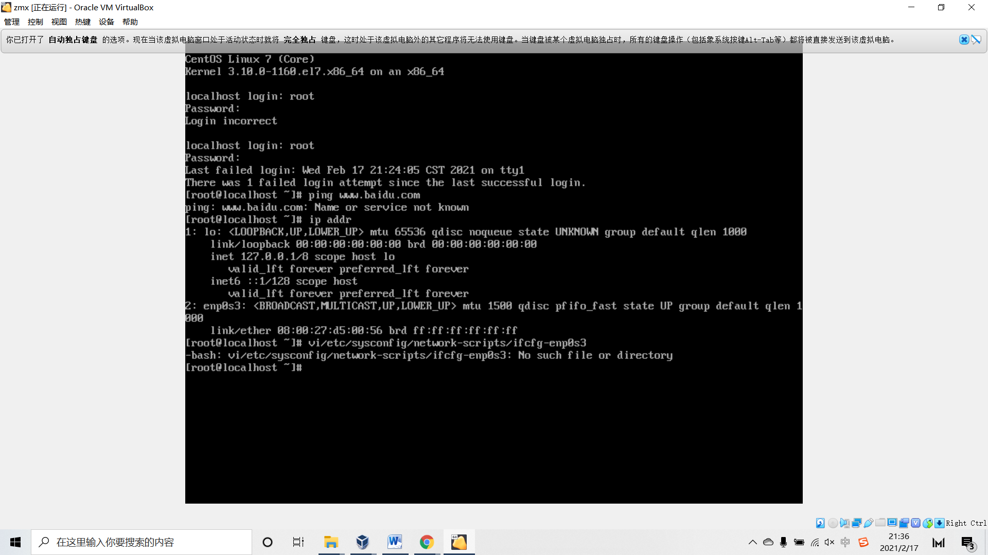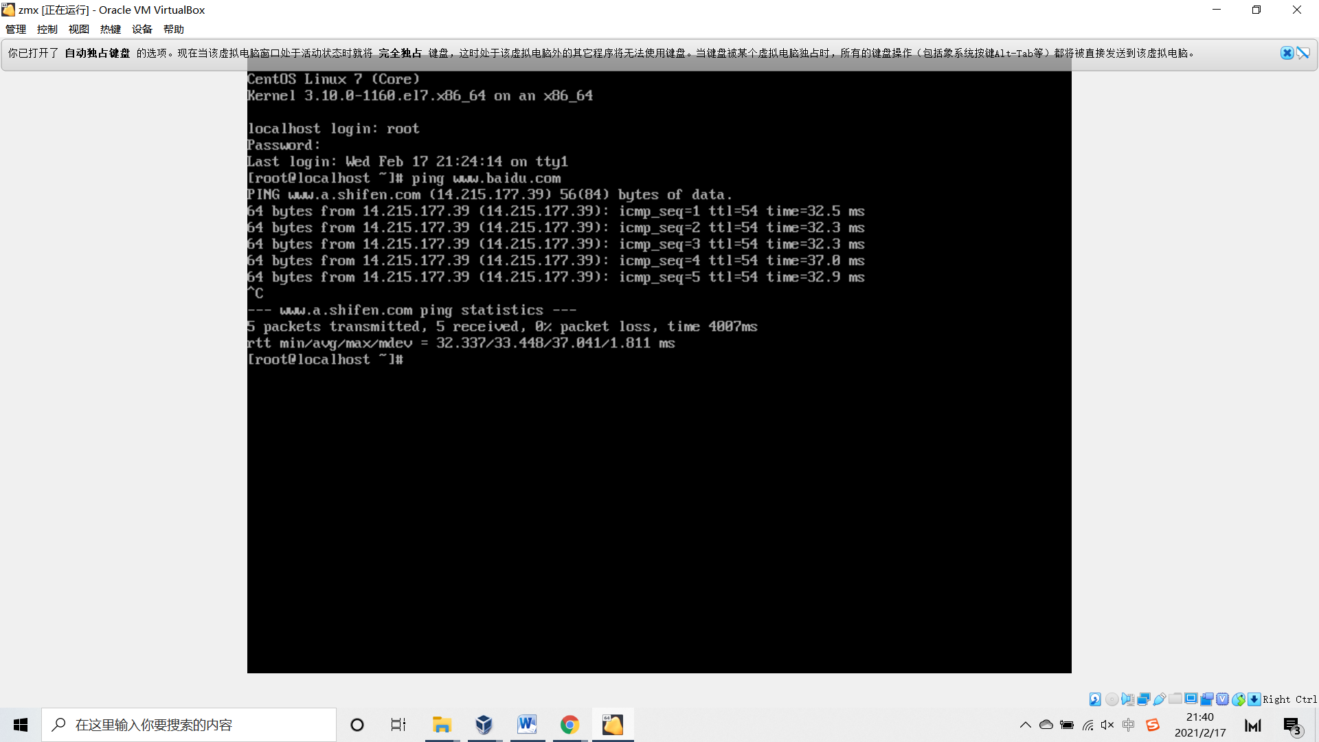 重啟后,再ping一下www.baidu.com ,發現網絡現在已經連上了,ctrl+C 中斷ping,不然會一直ping。