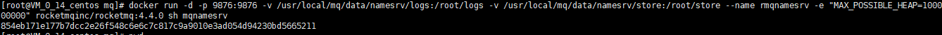 docker run -d -p 9876:9876 -v {自己的路徑}/data/namesrv/logs:/root/logs -v {RmHome}/data/namesrv/store:/root/store --name rmqnamesrv -e "MAX_POSSIBLE_HEAP=100000000" rocketmqinc/rocketmq:4.4.0 sh mqnamesrv