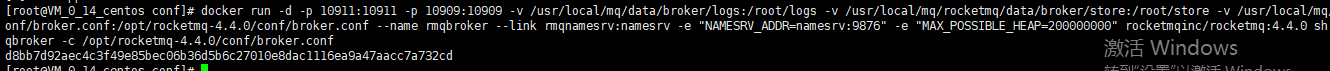 docker run -d -p 10911:10911 -p 10909:10909 -v {自己的路徑}/data/broker/logs:/root/logs -v {自己的路徑}/rocketmq/data/broker/store:/root/store -v {自己的路徑}/conf/broker.conf:/opt/rocketmq-4.4.0/conf/broker.conf --name rmqbroker --link rmqnamesrv:namesrv -e "NAMESRV_ADDR=namesrv:9876" -e "MAX_POSSIBLE_HEAP=200000000" rocketmqinc/rocketmq:4.4.0 sh mqbroker -c /opt/rocketmq-4.4.0/conf/broker.conf