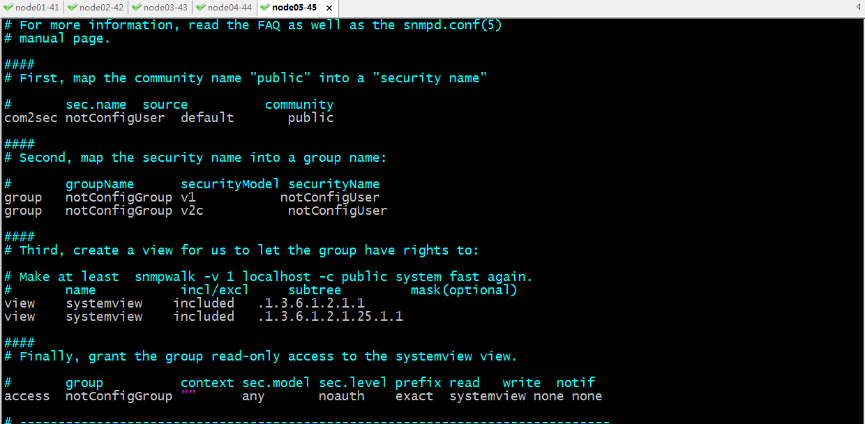 提示:以上配置表示,首先將社區名public映射為一個安全的名稱notConfigUser;其次映射安全名notConfigUser映射為組名notConfigGroup,并將安全模式v1和v2c加入到組內,這表示只要在這個組內的成員都兼容v1 和v2c兩個版本的安全模式;第三是創建一個視圖,名為systemview,并配置允許那些葉子節點或子樹的oid加入到此視圖;最后授權notConfigGroup組里的任何用戶,用任何安全模式都對systemview擁有只讀權限,不擁有寫權限,也沒有例外;簡單點講以上配置表示只要是public社區的用戶,都將識別為notConfigGroup里的用戶,而對應組里的用戶擁有systemview授權的子樹只讀權限;這里需要注意,子樹就是我們要獲取的數據對象的標識(oid);我們授權只需要修改對應systemview擁有那些子樹或葉子節點即可;授權一顆子樹意味著該子樹下的所有葉子節點或子樹都可以被訪問,授權一個葉子節點表示精確只能看到對應葉子節點;