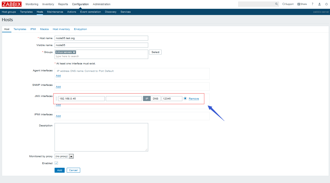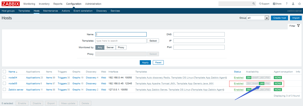 在zabbix web上添加node05并指定使用jmx接口來采集數據