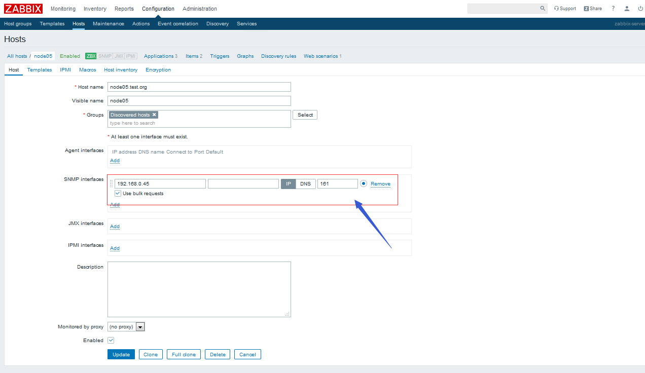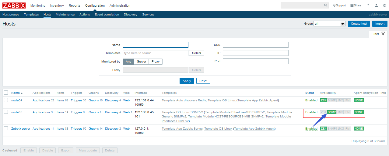查看主機列表,看看node05對應的SNMP信道是否變綠了?