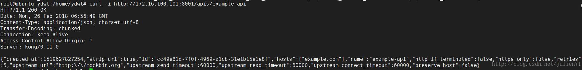 注意:以上三部都是在101上完成的,且官網上都有https://getkong.org/install/docker/?_ga=2.68209937.1607475054.1519611673-2089953626.1519354770,接下來的第四步則是在另一主機102上完成,同一主機上可以用link,不同主機的容器關聯就不能使用link了,如下配置即可