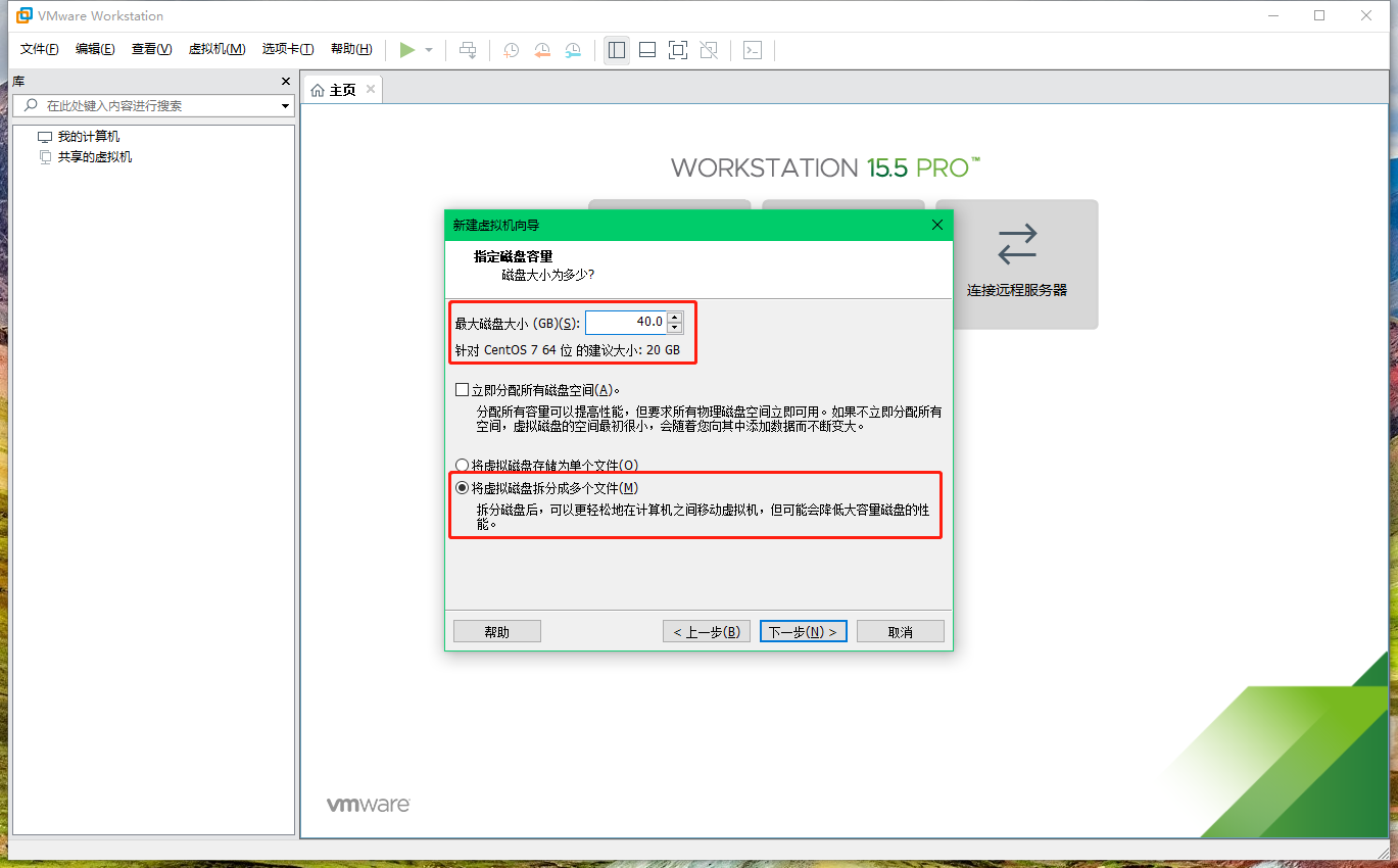 2.12 在新建虛擬機(jī)向?qū)?/code>的第十一步配置最大磁盤大小與虛擬磁盤是否拆分