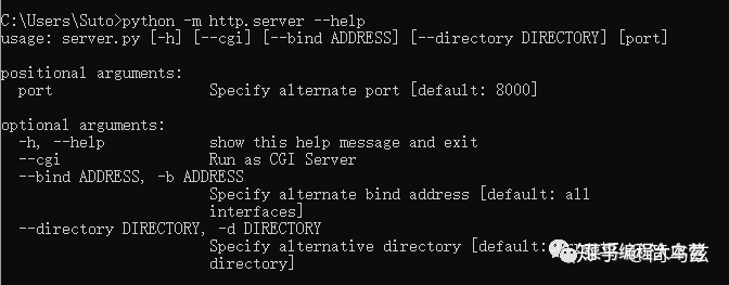 在Python3.7中,http.server提供了5種參數,調用下面幫助命令可顯示如下:python -m http.server --help