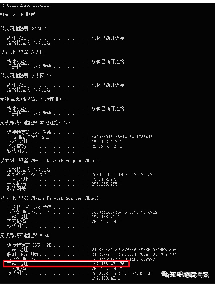 Windows平臺可以通過ipconfig(Linux平臺通過ifconfig -a )獲取IP,注意選用的是無線局域網適配器WLAN中的IPv4地址。