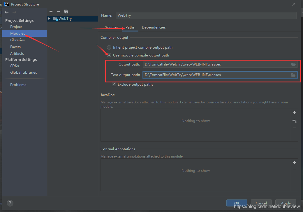 之后配置文件夾路徑;快捷鍵ctrl + shift + Alt + s -> Modules-> Paths -> 選中“Use module compile out path” -> 將Outputpath 和Test output path 路徑都設置為classes文件夾