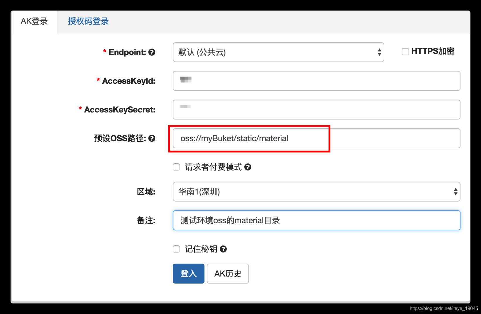 預設路徑一定要設置剛才的 oss://myBuket/static/material