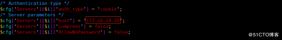 $cfg['Servers'][$i]['host'] = '172.16.10.20'; 更改其為mysql容器的IP地址