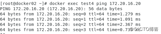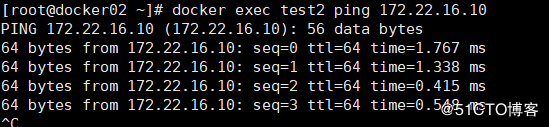 使用第二臺docker服務器上的容器test2對第一臺docker服務器上的容器test1進行ping測試