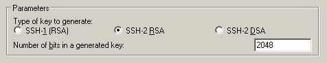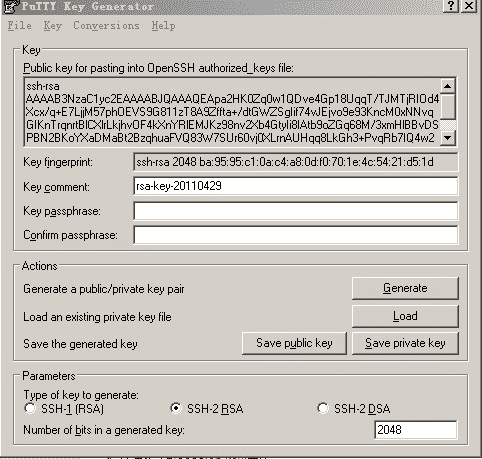 該工具可以生成三種格式的key:SSH-1(RSA) SSH-2(RSA) SSH-2(DSA),我們采用默認的格式即SSH-2(RSA)。Number of bits in a generated key這個是指生成的key的大小,這個數值越大,生成的key就越復雜,安全性就越高。這里我們寫2048.