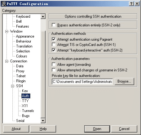 4)再設置putty選項,點窗口左側的SSh –> Auth,單擊窗口右側的Browse…選擇剛剛生成的私鑰,再點Open,此時輸入root,就不用輸入密碼就能登錄了。