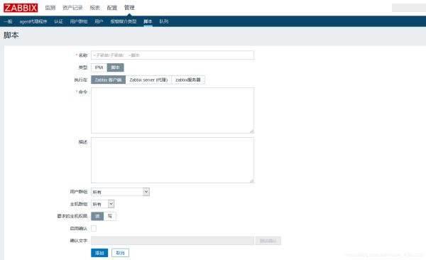 打開zabbix_server的web配置界面,選擇管理,接著選擇藍色導航條中的腳本選項,最后點擊創建腳本。