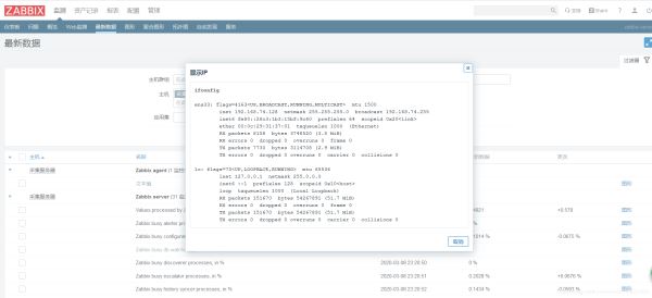 腳本創建完成后,我們去到zabbix_server的web界面中的監測,然后找到藍色導航條中的最新數據,找一臺已經已經安裝了zabbix客戶端的window主機執行。因為ifconfig是linux主機的系統命令,所以測試只能找安裝了zabbix客戶端的linux主機測試。