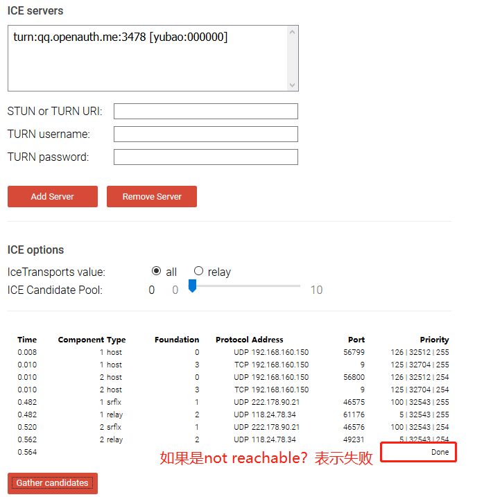 搭建好后可以在 https://webrtc.github.io/samples/src/content/peerconnection/trickle-ice/ 測試一下有沒有成功,如下: