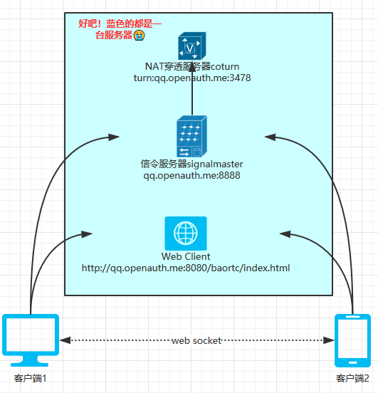 - 基于WebSocket的信令服務器(Signaling Server),用于建立點對點的通道。Web客戶端。