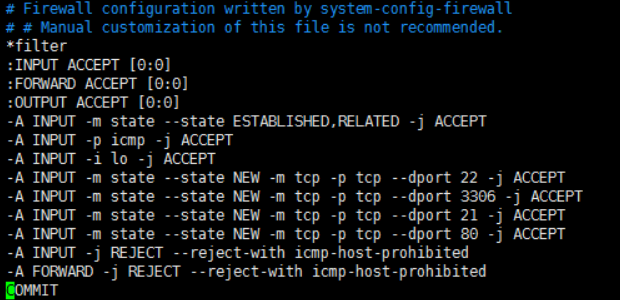 -A INPUT -m state --state NEW -m tcp -p tcp --dport 3306 -j ACCEPT -A INPUT -m state --state NEW -m tcp -p tcp --dport 80 -j ACCEPT