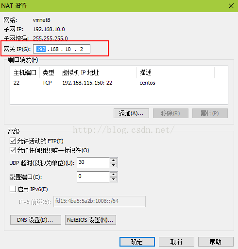 在這個界面接著點"NAT設置",查看虛擬機的網關,這個網關在第三步要用。我這里的網關是192.168.10.2。