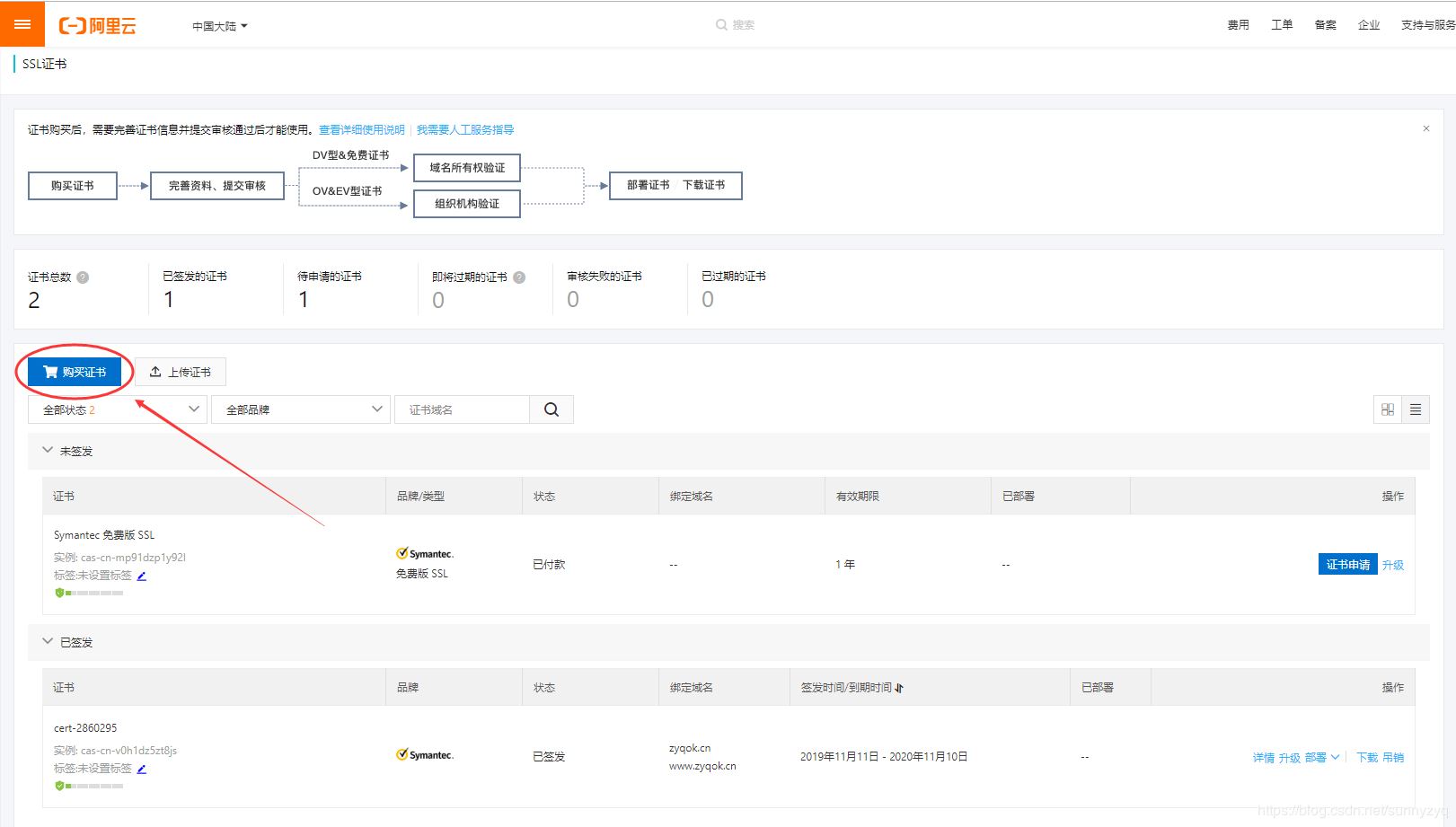 如果你不是阿里云客戶,那么這一步可以跳過,然后自行百度 “SSL證書” 到相關廠商購買,或者百度 “免費SSL證書” 。