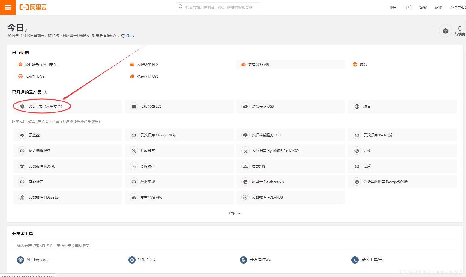 (1)登錄阿里云,然后找到 【SSL證書】一欄,點擊( 因為我已經開通過了該功能,所以你的位置可能和我的位置不一樣,自己去面板找 )。