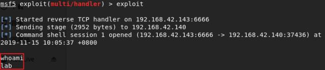 開啟msf進(jìn)行監(jiān)聽并點(diǎn)擊提交,可看到成功返回一個(gè)shell。如下圖所示: