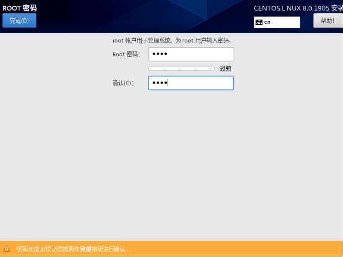 centos有密碼校驗機制,當密碼比較簡單的時候,會讓你點擊兩次完成按鈕