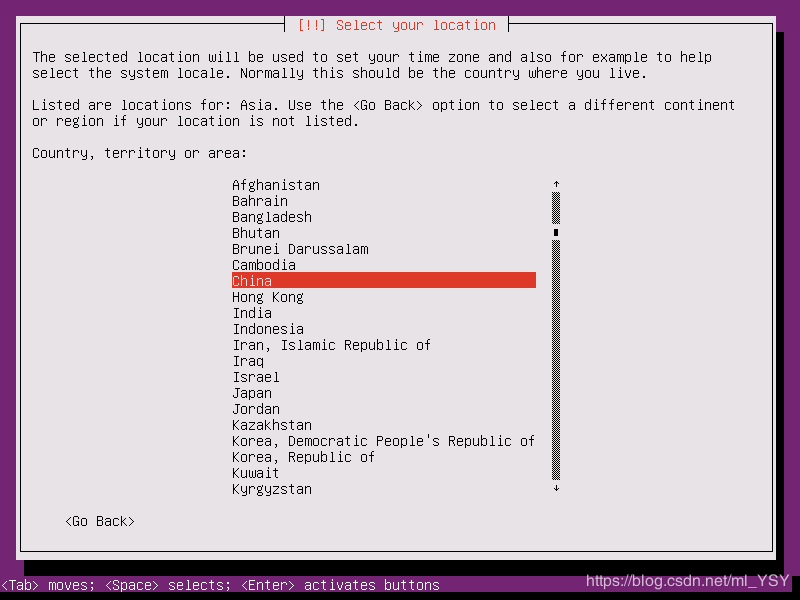 此時,選擇的是所在洲,我是中國的所以選亞洲(Asia),然后你將看到第3幅圖中的China,選中它,然后回車(enter)此時要按兩次;