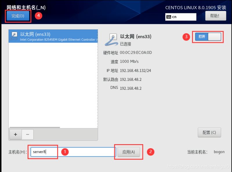 7、首先打開網卡開關,然后查看是否能獲取到IP地址,更改主機名,點擊應用,點擊完成。