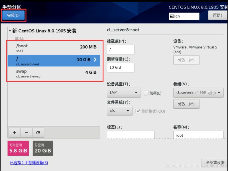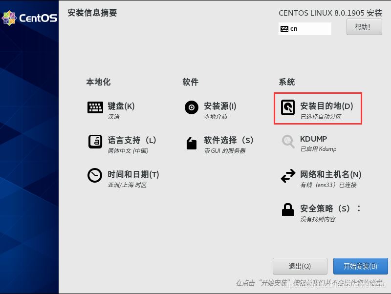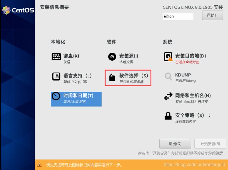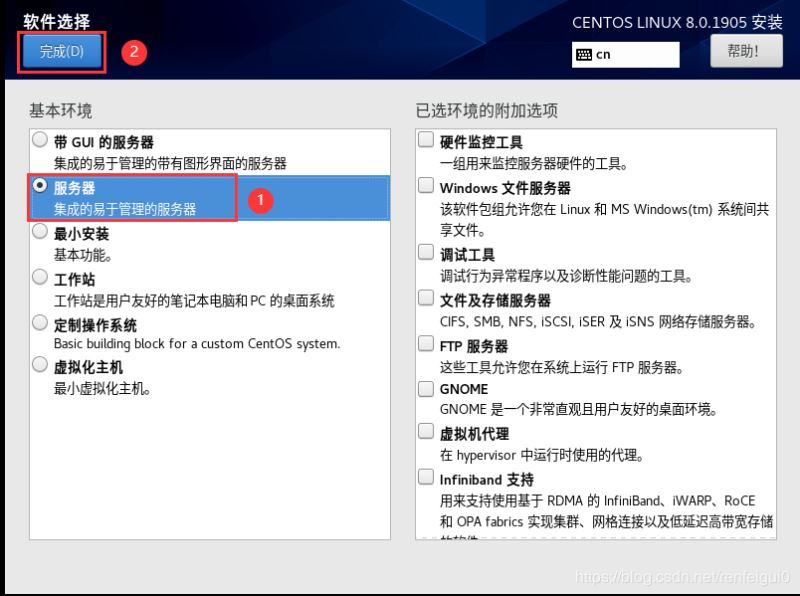 11、此處系統選擇“服務器”,安裝完成后進入命令行系統,然后點擊完成。(若選擇帶GUI的服務器,安裝完成后進入圖形化桌面系統)。