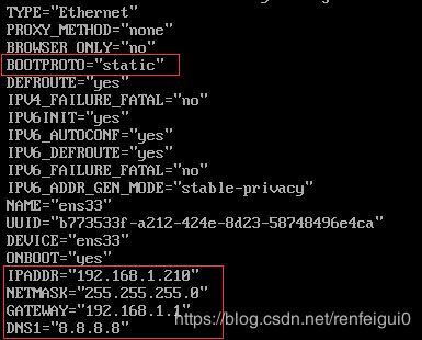1、以root賬號登錄系統,編輯文件/etc/sysconfig/network-scripts/ifcfg-ens33,配置ip地址等信息,修改下圖紅框內容。