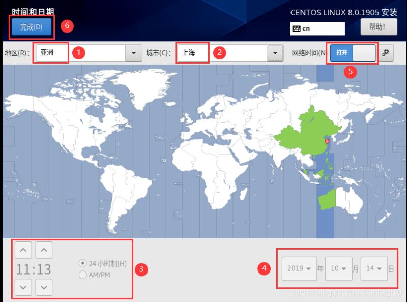 9、時區選擇亞洲、上海,設置正確的日期和時間,打開網路時間開關(如果宿主主機已經連接互聯網,則會自動校準時間),然后點擊完成。