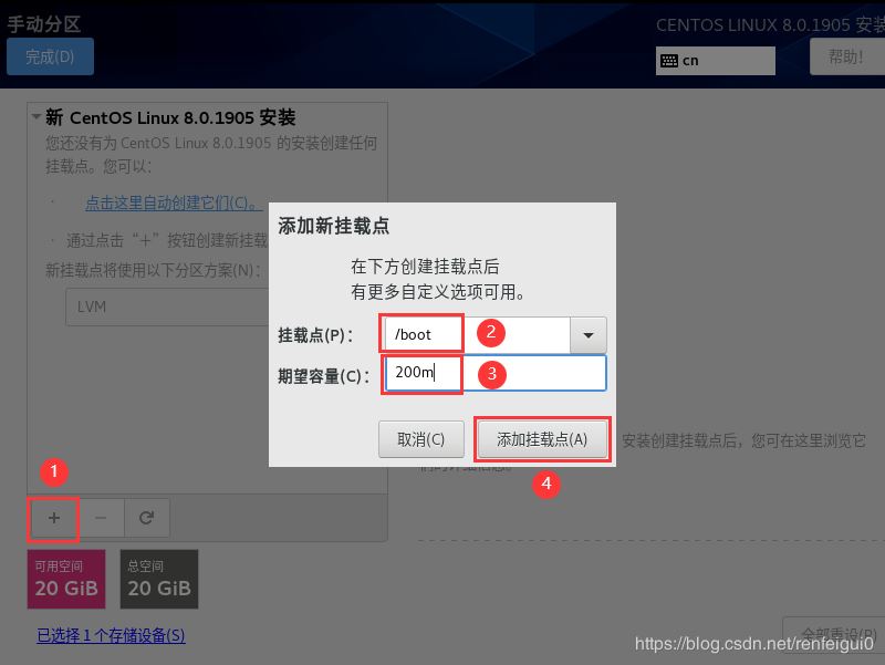 14、彈出下圖界面,點擊加號,選擇/boot,給boot分區分200M,最后點擊添加掛載點。