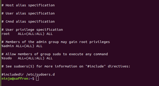 默認情況下,在大多數 Linux 發行版中(如屏幕快照所示),/ etc / sudoers 的 RunAs 規范文件中的 ALL 關鍵字,允許 admin 或 sudo 分組中的所有用戶,以系統上任何有效用戶的身份運行任何命令。