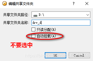 這里要注意,設置共享目錄時,有一個自動掛載的選項【切記不要選中】(如下圖),否則Ubuntu系統啟動時就自動將該目錄掛載到/media目錄下去了,而它掛載時使用的是超級用戶的權限,會造成其他的普通用戶無法訪問,到時還要去折騰用戶權限等一堆的事,很麻煩,還不如自己手動寫兩個命令搞定來的干脆!