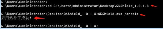 4、 輸入命令對應功能,啟用熱補丁命令:QKShield.exe /enable ;禁用熱補丁命令:QKShield.exe/disable 。