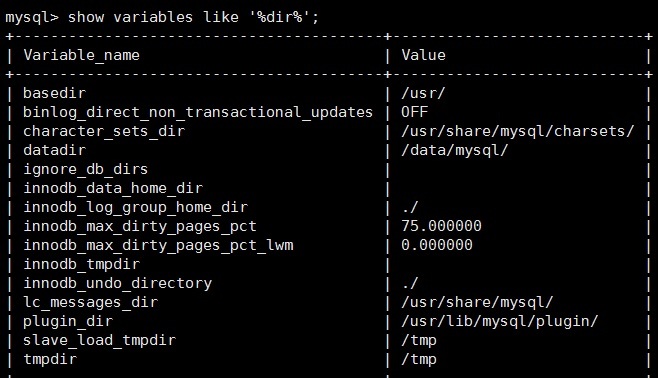 mysql>show variables like '%dir%'; <==當顯示datadir 為/data/mysql時,修改成功